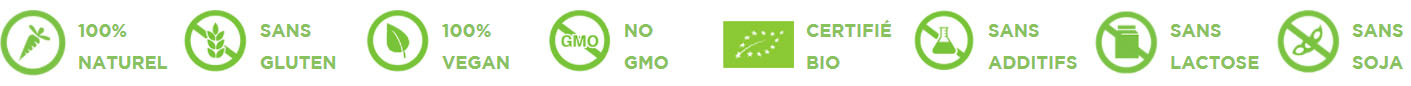 Nous voulons nousassurer que vous obtenez la meilleure qualité possible de superfoods. C’est pourquoi nous vous donnons la garantie que tout est : Certifié biologique par l’USDA, vérifié sans OGM, 100% végétal et sans gluten, noix, soja, produits laitiers, édulcorants, charges, additifs, conservateurs, arômes, glyphosate et métaux lourds. Tous nos lots sont testés par des laboratoires tiers.