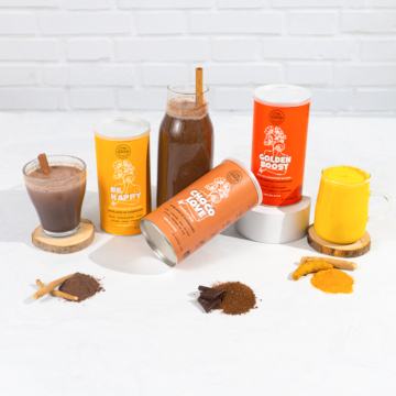 Chocolate latte powder with Ayurvedic herbs and adaptogenic mushrooms.
